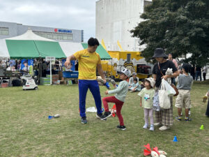 ターゲットスローではジャベボールを得点のやアスリオンの描いてある幕に向かって投げるアトラクションです。スズキのやり投げこの夏開催された世界陸上日本代表の長沼元選手や、レジェンド新井選手が直々に手ほどきしながら楽しくジャベボール体験ができました。10m計測が小中学生が中心にくらべ、ターゲットスローでは幼児から大人まで体験でき幅広い年代に楽しんでいただけたアトラクションになりました。